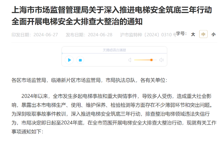 随着城市化进程的加速,电梯已成为现代建筑不可或缺的垂直交通工具,电梯的安全问题日益受到社会的关注。近期,上海市市场监督管理局在全市范围开展电梯安全大排查大整治行动。