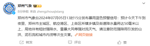 股票配资学习 刚刚!郑州发布暴雨蓝色预警 局地伴有短时强降水、雷暴大风